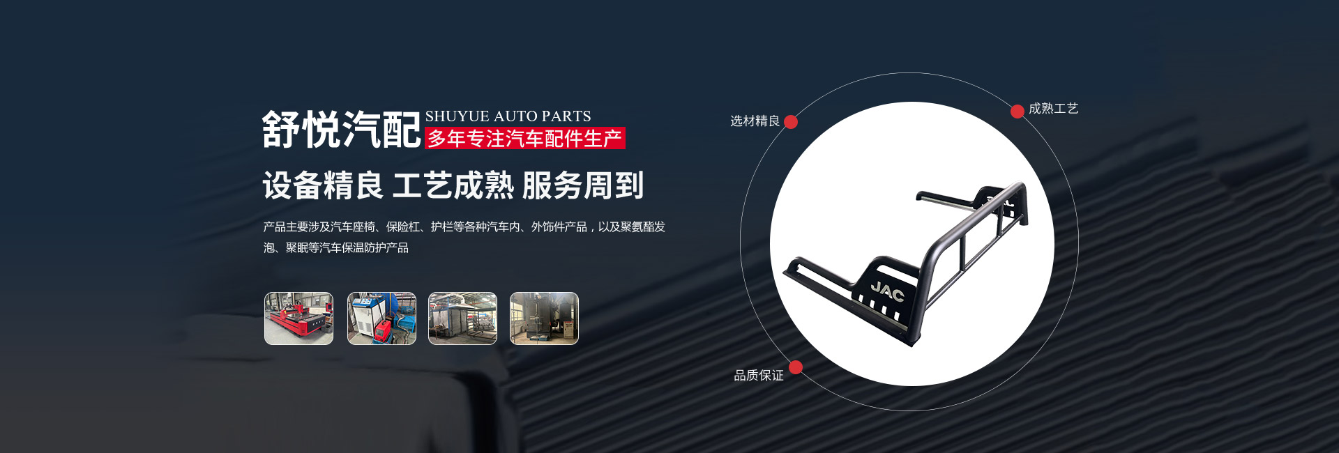 揚(yáng)州舒悅汽配有限公司經(jīng)過(guò)多年的穩(wěn)定發(fā)展,業(yè)績(jī)一直蒸蒸日上。公司產(chǎn)品主要涉及汽車(chē)座椅、保險(xiǎn)杠、護(hù)欄等各種汽車(chē)內(nèi)、外飾件產(chǎn)品,以及聚氨酯發(fā)泡、聚脲等汽車(chē)保溫防護(hù)產(chǎn)品。其主要是為江淮、金龍,奇瑞等公司服務(wù),已連續(xù)多年成為江淮、金龍等公司的A級(jí)供應(yīng)商。        公司成立于1997年,現(xiàn)坐落于揚(yáng)州市儀征劉集盤(pán)古工業(yè)集中區(qū)202號(hào),公司占地面積26640平 方米,廠房建筑面積18512平方米。公司擁有先進(jìn)的制造設(shè)備、可靠的生產(chǎn)工藝、完善的檢測(cè)手段和科學(xué)的管理,在售前和售后服務(wù)中做到快速反應(yīng),應(yīng)急應(yīng)變,為客戶提供優(yōu)良產(chǎn)品和滿意服務(wù)。公司的產(chǎn)品開(kāi)發(fā)能力和生產(chǎn)規(guī)模在同行業(yè)中處于前列的地位。        揚(yáng)州舒悅?cè)吮小罢\(chéng)信雙嬴”的原則,發(fā)揚(yáng)“誠(chéng)信、務(wù)實(shí)、創(chuàng)新、貢獻(xiàn)”的企業(yè)精神,恪守“顧客至上”的經(jīng)營(yíng)宗旨,致精從業(yè),不斷引進(jìn)新技術(shù)、新材料。以優(yōu)良的產(chǎn)品、合理的價(jià)格和周到的服務(wù)參與市場(chǎng)競(jìng)爭(zhēng)。公司愿與國(guó)內(nèi)外朋友建立真誠(chéng)的合作伙伴關(guān)系,攜手共創(chuàng)輝煌!